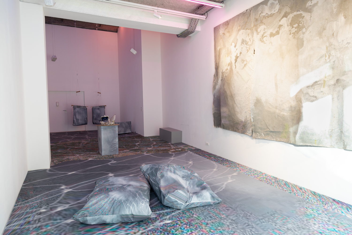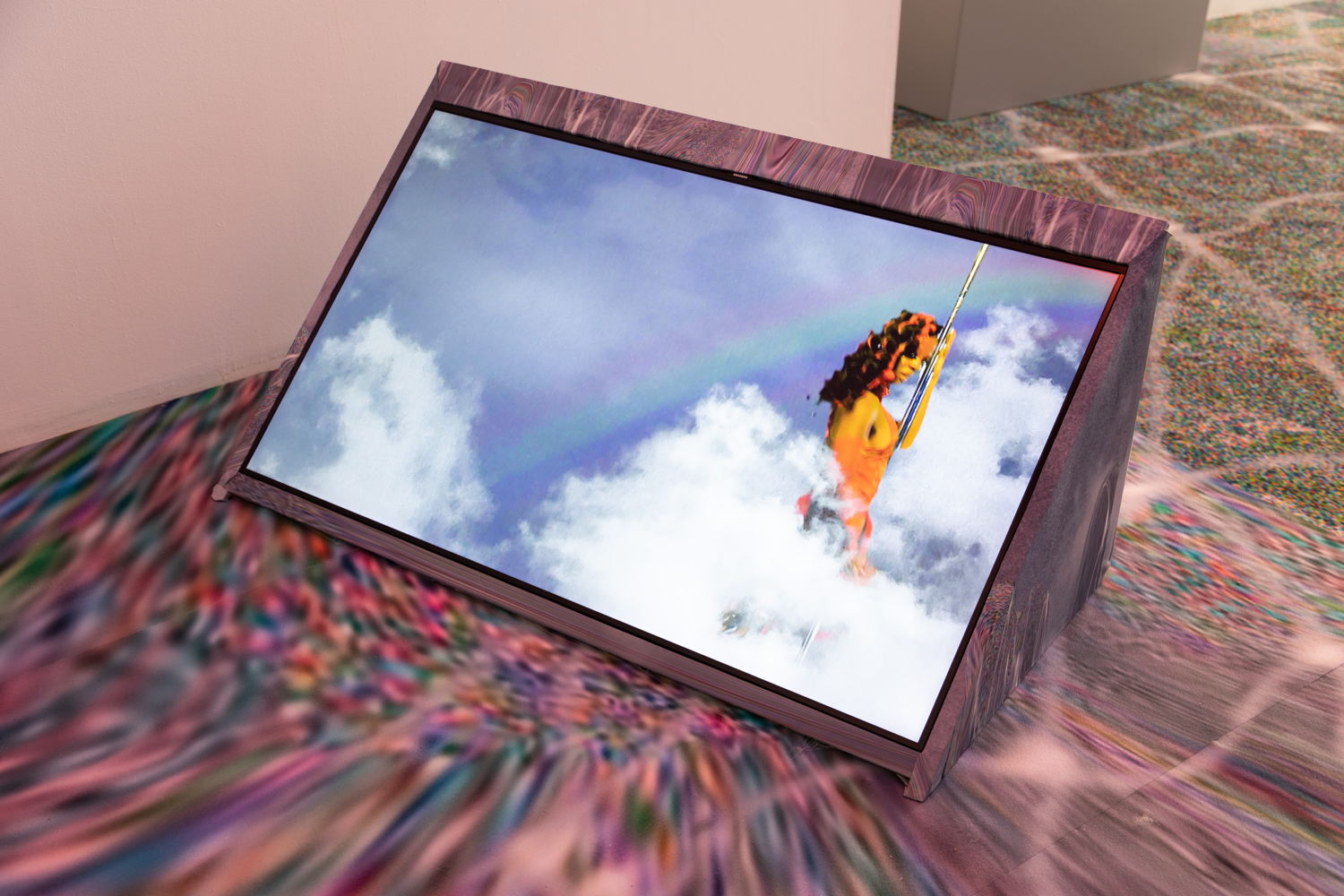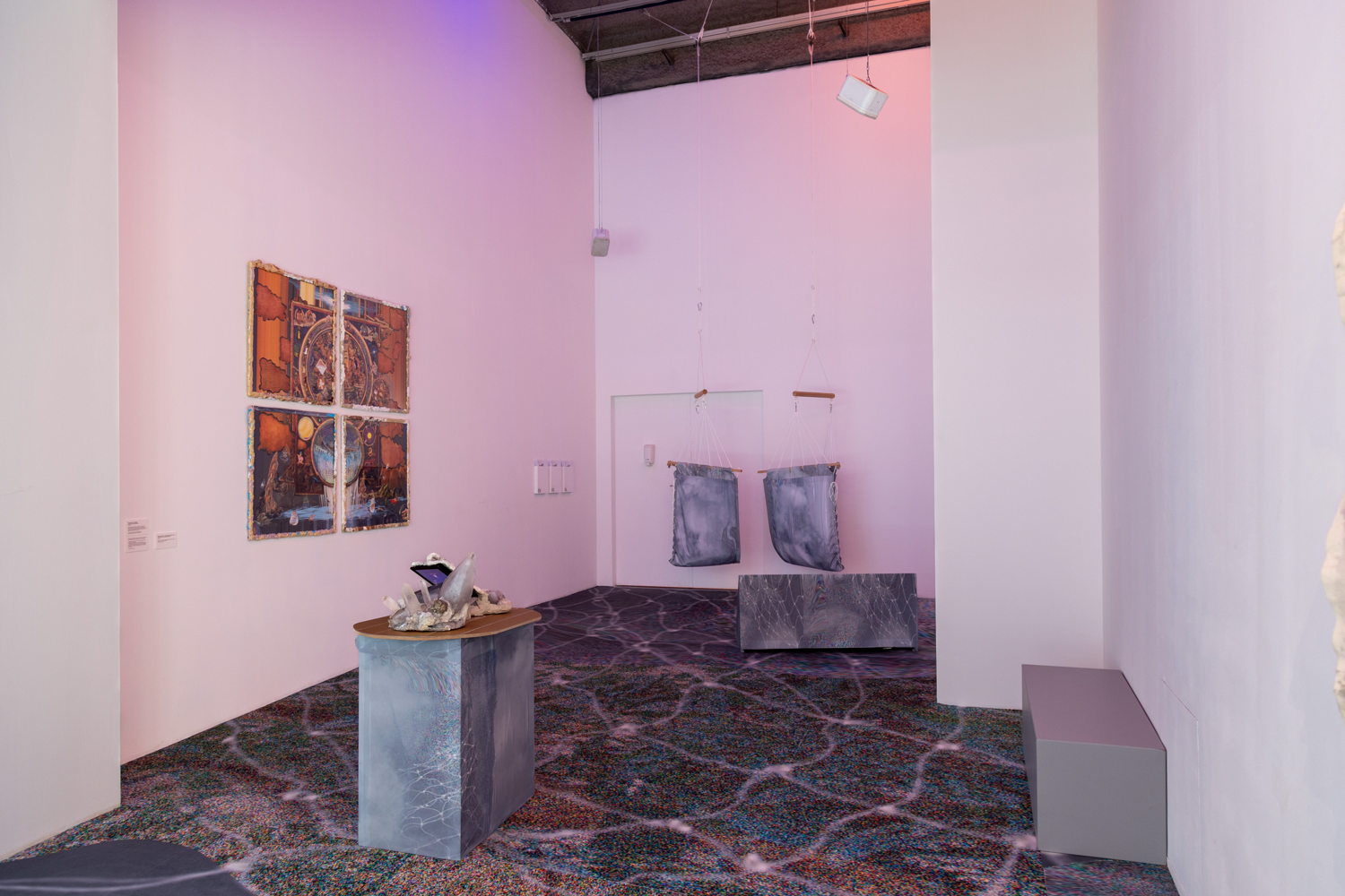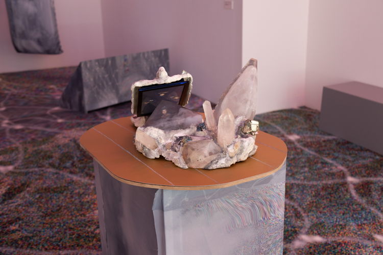 'Roaming the Imaginal' marks Eden Tinto Collins' first exhibition in Belgium. The immersive audiovisual installation delves into the errant story of an interconnected world translated into landscape, movement, posture and sound. Gravitating around the notion of the imaginal as that iconic space between the real and the imaginary, the exhibition journeys through the shadows of a cosmic void, resonating with the deep sounds of the universe's vibrational core.